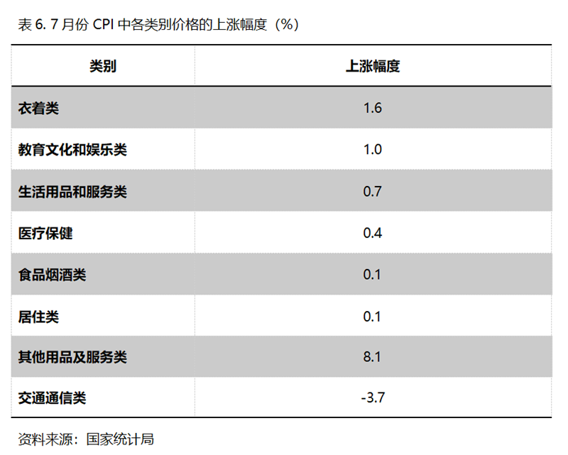 7月份,在CPI 8個(gè)類別中有7個(gè)類別保持上漲,1個(gè)類別下降。上漲的7個(gè)類別包括衣著類價(jià)格同比上漲1.6%,教育文化和娛樂(lè)類上漲1.0%,生活用品及服務(wù)類上漲0.7%,醫(yī)療保健類上漲0.4%,食品煙酒類上漲0.1%,居住類上漲0.1%,其他用品和服務(wù)類上漲8.1%;下降的雖然就交通通信類1個(gè)類別,但降幅仍還比較大,7月份同比下降3.7%。