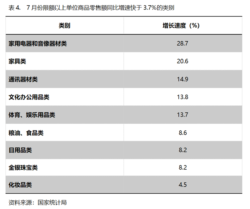 7月份,限額以上單位商品零售額同比增速快于社會(huì)消費(fèi)品零售總額3.7%增速的共有9類,即家用電器和音像器材類同比增長(zhǎng)28.7%,家具類增長(zhǎng)20.6%,通訊器材類增長(zhǎng)14.9%,文化辦公用品類增長(zhǎng)13.8%,體育、娛樂(lè)用品類增長(zhǎng)13.7%,糧油、食品類增長(zhǎng)8.6%,日用品類增長(zhǎng)8.2%,金銀珠寶類增長(zhǎng)8.2%,化妝品類增長(zhǎng)4.5%。