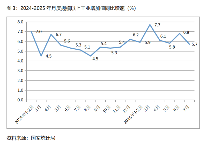 (一)工業(yè)增速由升轉(zhuǎn)落。7月份,規(guī)模以上工業(yè)增加值同比增長(zhǎng)5.7%,比上月增長(zhǎng)6.8%回落了1.1個(gè)百分點(diǎn),6月份比5月份回升了1.0個(gè)百分點(diǎn)。從工業(yè)三大門(mén)類看,采礦業(yè)和制造業(yè)增速比上月回落,電力、熱力、燃?xì)饧八a(chǎn)和供應(yīng)業(yè)增速回升,7月份采礦業(yè)同比增長(zhǎng)5.0%,比上月回落1.1個(gè)百分點(diǎn);制造業(yè)增長(zhǎng)6.2%,比上月回落1.2個(gè)百分點(diǎn);電力、熱力、燃?xì)饧八a(chǎn)和供應(yīng)業(yè)增長(zhǎng)3.3%,比上月回升1.5個(gè)百分點(diǎn)。今年以來(lái)工業(yè)增速波動(dòng)的運(yùn)行,反映出工業(yè)的回升仍缺乏穩(wěn)固的基礎(chǔ)。