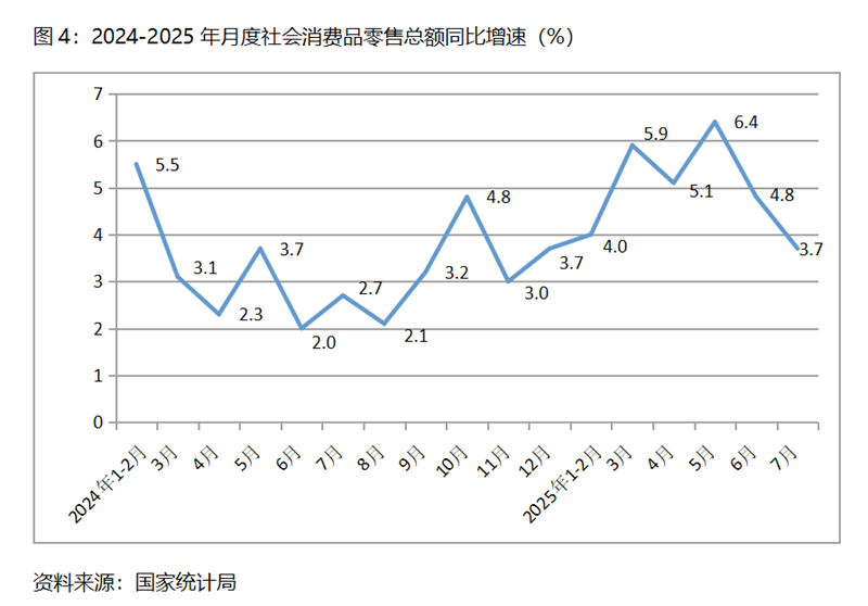 (二)零售增速持續(xù)回落。7月份,社會(huì)消費(fèi)品零售總額同比增長(zhǎng)3.7%,比6月份增長(zhǎng)4.8%回落了0.9個(gè)百分點(diǎn),6月份比5月份增長(zhǎng)6.4%回落了1.6個(gè)百分點(diǎn),其中餐飲收入自6月份明顯回落后繼續(xù)保持低速增長(zhǎng),6月份餐飲收入同比增長(zhǎng)0.9%,7月份增長(zhǎng)1.1%。社會(huì)消費(fèi)品零售總額增速出現(xiàn)持續(xù)回落,除了餐飲收入持續(xù)低速增長(zhǎng)的原因外,商品零售額增速的回落也是一個(gè)重要因素。這一變化趨勢(shì)對(duì)消費(fèi)需求的擴(kuò)大提出了新的挑戰(zhàn)。