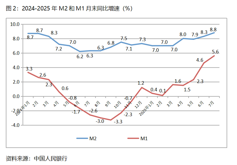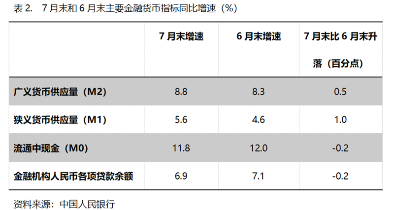(二)M2增速持續(xù)回升。7月末,廣義貨幣供應(yīng)量(M2)同比增長(zhǎng)8.8%,比6月末增長(zhǎng)8.3%回升0.5個(gè)百分點(diǎn),6月末增速比5月末7.9%的增速回升了0.4個(gè)百分點(diǎn),保持了持續(xù)回升勢(shì)頭;狹義貨幣供應(yīng)量(M1)同比增長(zhǎng)5.6%,比6月末增長(zhǎng)4.6%回升1.0個(gè)百分點(diǎn),6月末增幅比5月末2.3%增幅回升2.3個(gè)百分點(diǎn);流通中貨幣(M0)增速持續(xù)小幅回落,7月末同比增長(zhǎng)11.8%,比6月末增長(zhǎng)12.0%回落0.2個(gè)百分點(diǎn),而6月末增速比5月末增速回落0.1個(gè)百分點(diǎn)。7月末M2和M1增速的持續(xù)回升,M0增速的基本持平,表明貨幣政策仍在向適度寬松方向的要求運(yùn)行, M1緩慢的增長(zhǎng)仍需要給予高度關(guān)注。