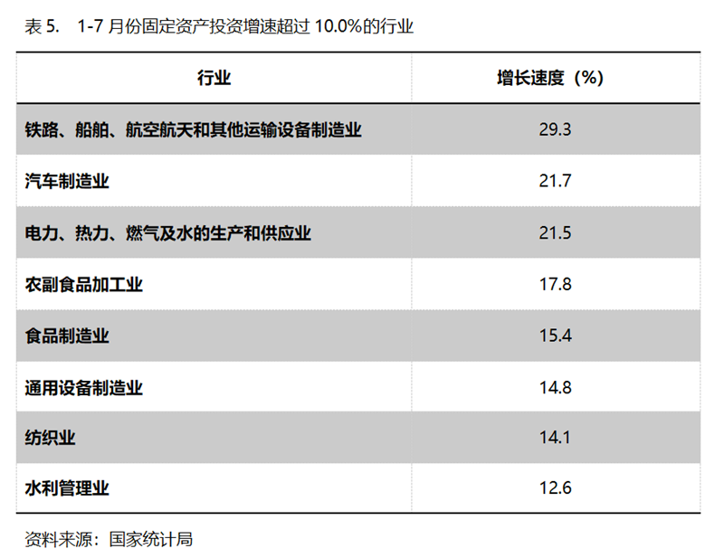 1-7月份,固定資產(chǎn)投資增速超過(guò)10.0%的主要行業(yè)共8個(gè),即鐵路、船舶、航空航天和其他運(yùn)輸設(shè)備制造業(yè)增長(zhǎng)29.3%,汽車(chē)制造業(yè)增長(zhǎng)21.7%,電力、熱力、燃?xì)饧八纳a(chǎn)和供應(yīng)業(yè)增長(zhǎng)21.5%,農(nóng)副食品加工業(yè)增長(zhǎng)17.8%,食品制造業(yè)增長(zhǎng)15.4%,通用設(shè)備制造業(yè)增長(zhǎng)14.8%,紡織業(yè)增長(zhǎng)14.1%,水利管理業(yè)增長(zhǎng)12.6%。