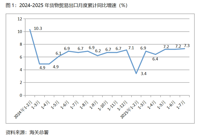 (一)貨物出口增速由平轉(zhuǎn)升。1-7月份,貨物出口同比增長(zhǎng)7.3%,比1-6月份增長(zhǎng)7.2%回升0.1個(gè)百分點(diǎn),1-6月份與1-5月份持平,增速呈現(xiàn)出由平轉(zhuǎn)升的態(tài)勢(shì)。貨物出口對(duì)主要貿(mào)易出口經(jīng)濟(jì)體增速有升有平也有落,1-7月份對(duì)歐盟出口同比增長(zhǎng)8.2%,比1-6月份7.9%增速回升0.3個(gè)百分點(diǎn);對(duì)美國(guó)出口下降11.6%,比1-6月份下降9.9%擴(kuò)大1.7個(gè)百分點(diǎn);對(duì)東盟出口增長(zhǎng)14.8%,比1-6月份14.3%增速回升0.5個(gè)百分點(diǎn);對(duì)拉丁美洲出口增長(zhǎng)8.4%,與1-6月份8.4%增速持平;對(duì)非洲出口增長(zhǎng)25.9%,比1-6月份23.0%增速回升2.9個(gè)百分點(diǎn)。面對(duì)較為復(fù)雜嚴(yán)峻的國(guó)際形勢(shì),出口增速由平轉(zhuǎn)升,充分說(shuō)明我國(guó)出口有著較強(qiáng)的韌性。
