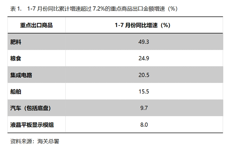1-7月份,出口金額同比增速超過(guò)7.3%的重點(diǎn)商品共有6類,即肥料出口增長(zhǎng)49.3%,糧食增長(zhǎng)24.9%,集成電路增長(zhǎng)20.5%,船舶增長(zhǎng)15.5%,汽車(chē)(包括底盤(pán))增長(zhǎng)9.7%,液晶平板顯示模組增長(zhǎng)8.0%。