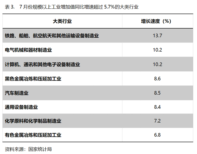 7月份,增長(zhǎng)速度超過(guò)規(guī)模以上工業(yè)增長(zhǎng)5.7%的主要大類行業(yè)共有8個(gè),即鐵路、船舶、航空航天和其他運(yùn)輸設(shè)備制造業(yè)同比增長(zhǎng)13.7%,電氣機(jī)械和器材制造業(yè)增長(zhǎng)10.2%,計(jì)算機(jī)、通訊和其他電子設(shè)備制造業(yè)增長(zhǎng)10.2%,黑色金屬冶煉和壓延加工業(yè)增長(zhǎng)8.6%,汽車(chē)制造業(yè)增長(zhǎng)8.5%,通用設(shè)備制造業(yè)增長(zhǎng)8.4%,化學(xué)原料和化學(xué)制品制造業(yè)增長(zhǎng)7.2%,有色金屬冶煉和壓延加工業(yè)增長(zhǎng)6.8%。