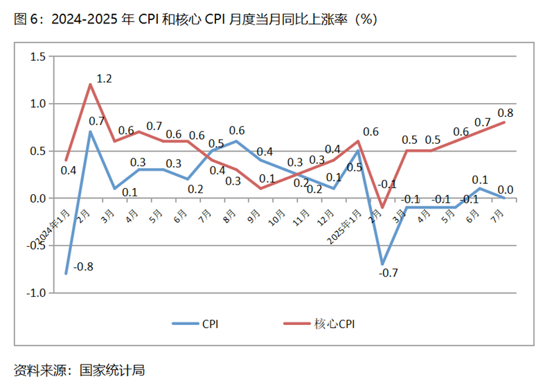 (四) CPI漲幅比上月回落。7月份,CPI同比漲幅持平,比6月份上漲0.1%回落0.1個(gè)百分點(diǎn), 自3月份以來(lái)一直保持在-0.1-0.1%區(qū)間,持續(xù)呈現(xiàn)低位運(yùn)行態(tài)勢(shì)。7月份,核心CPI同比上漲0.8%,比6月份上漲0.7%上升了0.1個(gè)百分點(diǎn)。雖然核心CPI漲幅保持回升的態(tài)勢(shì),經(jīng)濟(jì)運(yùn)行活力有所增強(qiáng),但漲幅也十分有限,加之CPI一直處于較低水平,經(jīng)濟(jì)運(yùn)行活力仍較為偏弱,宏觀政策更加積極和寬松仍十分必要。
