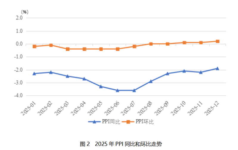 二是PPI呈“V”型走勢,同比繼續(xù)下降。PPI同比下降2.6%,降幅比上年略擴大0.4個百分點。生產(chǎn)資料和生活資料價格同步走低,且降幅較上年同期均有所擴大。其中,生產(chǎn)資料價格同比下降 3%,降幅較上年擴大 0.5 個百分點。從結(jié)構(gòu)上看,生產(chǎn)資料價格變動呈現(xiàn) “上游降幅更深、下游相對較小” 的梯度特征。上游采掘業(yè)價格整體下降9.0%,成為生產(chǎn)資料中降幅最大的品類;中游的原材料工業(yè)價格同比下降3.4%;主要受終端需求不足、產(chǎn)品同質(zhì)化競爭加劇等因素影響,下游的加工工業(yè)價格同比下降2.4%。生活資料中,食品價格下降1.6%,降幅比上年擴大0.5個百分點;衣著價格下降0.1%,降幅與上年持平;一般日用品價格上漲0.8%,漲幅比上年擴大0.8個百分點;耐用消費品價格下降3.3%,降幅比上年擴大1.1個百分點。主要能源行業(yè)價格大幅下降是拖累2025年P(guān)PI走勢的核心因素。其中,煤炭開采和洗選業(yè)價格同比下降15.7%,降幅較上年大幅擴大7.5個百分點。原因一是全球煤炭市場供過于求、國際煤炭價格持續(xù)走低,二是國內(nèi)煤炭行業(yè)產(chǎn)能優(yōu)化調(diào)整、清潔能源替代進(jìn)程加快,進(jìn)一步壓低了煤炭價格;石油和天然氣開采業(yè)價格同比下降 9.9%,降幅較上年擴大9.5個百分點,主要受國際地緣政治局勢緩和、全球原油產(chǎn)量增加導(dǎo)致的國際油價下行影響,國內(nèi)成品油價格聯(lián)動調(diào)整,進(jìn)而傳導(dǎo)至上游開采環(huán)節(jié)。上述兩大能源行業(yè)的價格深度下行,不僅直接拉低了采掘工業(yè)價格,還通過產(chǎn)業(yè)鏈傳導(dǎo)影響了原材料工業(yè)、加工工業(yè)乃至部分生活資料的成本與價格,成為PPI降幅擴大的重要因素。?